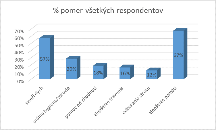 Napriek všetkým očakávaniam a odhadom, svieži dych nebol na prvom mieste benefitov, nakoľko iba 57% respondentov uviedlo práve tento plus žvania žuvačky vo svojich odpovediach. Najčastejšou odpoveďou na otázku č. 3 bolo prekvapujúco zlepšenie pamäti, zvýšenie koncentrácie či kognitývnych schopností. I keď až 67% všetkých opýtaných označilo, že žuje žuvačku aj kvôli tomuto benefitu, ani jeden z respondentov z vekovej kategórie 50-69 rokov neoznačil, že má s ním skúsenosť. Svieži dych po i počas žuvania žuvačky sa uplatnil najmä vo vekovej kategórii od 13-18 rokov (až 81%). Orálna hygiena resp. orálne zdravie sa rovnakým percentuálnym pomerom (33%) osvedčilo u respondentov najmä vo veku od 13-29 rokov. O trochu menej opýtaných (25%) bolo z vekovej kategórie 30-49 rokov. Pomoc pri chudnutí sa uplatnila najmä vo vekovej kategórii 30-49 rokov, a to vo veľkej miere, až 63%. Zlepšenie trávenia sme nenašli vo veľkej miere vo veku 13-29 rokov, no vo zvyšných dvoch vekových kategóriách sa osvedčila v rovnakej miere (38%). Fakt, že stresom trpia takmer všetky vekové kategórie, potvrdili aj výsledky našich dotazníkov. Všetky tri vekové kategórie 13-18, 19-29, 30-49 rokov siahnu na odbúranie stresu práve po žuvačke. Respondenti vo veku od 50 rokov nahor uviedli vo svojich odpovediach, že so zlepšením pamäti či odbúraním stresu nemajú žiadnú skúsenosť. Naopak žiakom a študentom, vo vekovom rozmedzí 13-29 rokov, žuvačka na zlepšenie pamäti a koncentrácie pri učení výrazne pomáha.